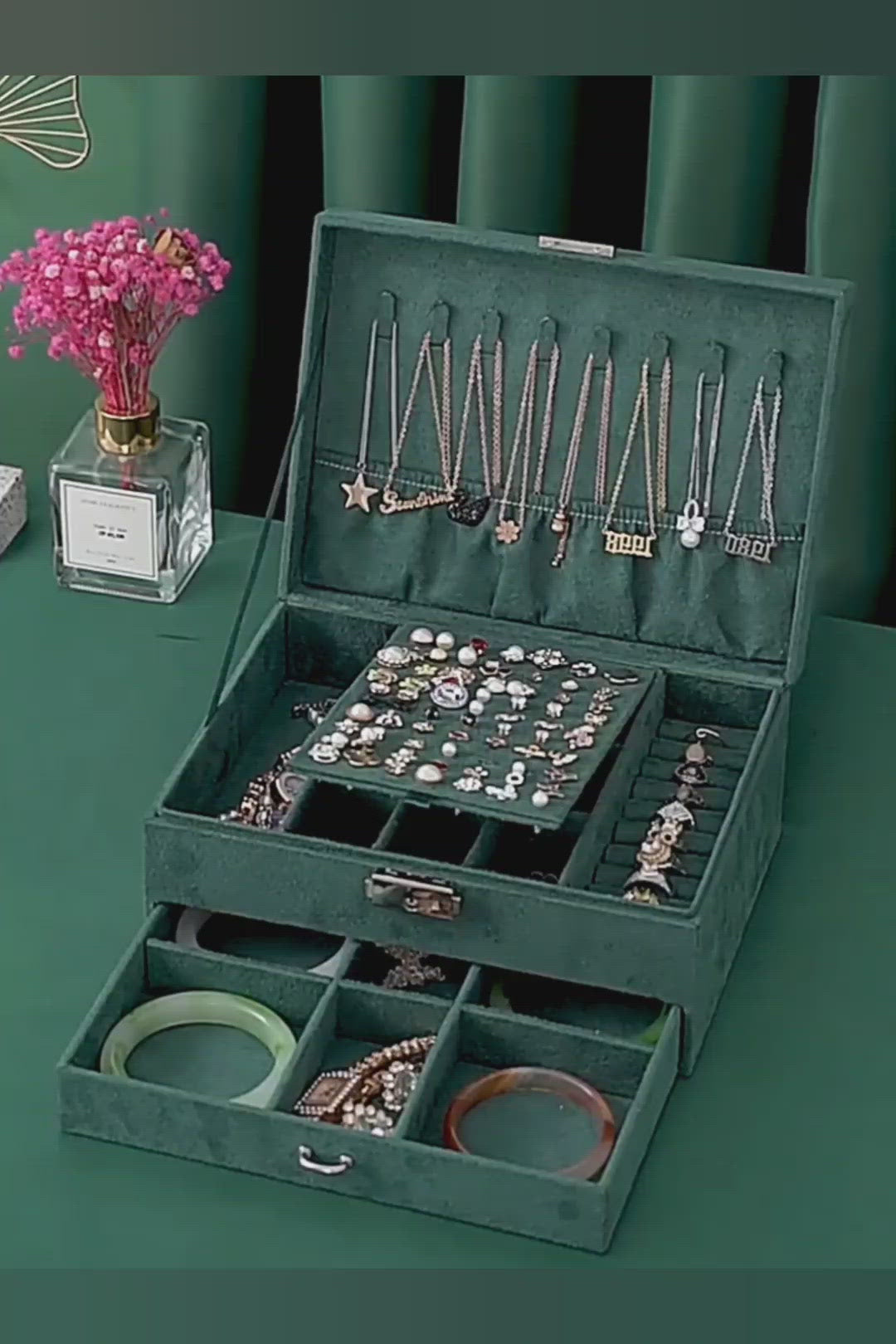 JEWELRY DISPLAY BOX - Three-layer dark green jewelry storage box, flannel material. It can store accessories such as earrings, earrings, necklaces, bracelets, ring brooches and watches. High-quality hardware lock durable and not easy to break, easy to open and close. Earring stud storage hole neatly arranged, clear at a glance three-layer design, layered different types, large space